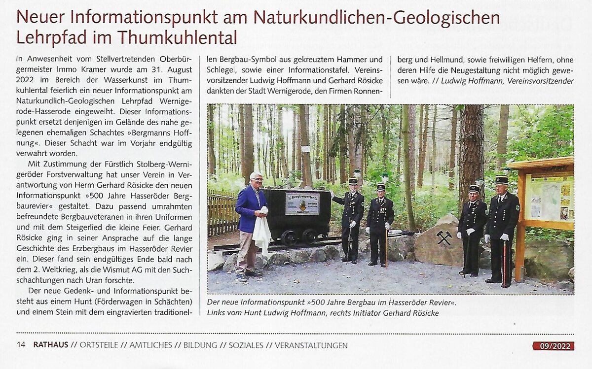 Der Naturkundlich-Geologische-Lehrpfad Wernigerode/Hasserode wurde auf Basis einer eigenen Gestaltungskonzeption des Geschichts- und Heimatvereines ab 1996 errichtet. Auf einem etwa 7 km langen Rundweg im ehemaligen Hasseröder Bergbaurevier zwischen Thumkuhlental und HSB-Bahnhof Steinerne Renne unterrichten Informationtafeln u.a. über folgende Themen: die Geologie des Harzes, der örtliche Bergbau, Wasser als Lebensmittel und Lebensraum oder den Wald als Nutz- und Schutzfaktor. Der Nachbau einer funktionstüchtigen Wasserkunst, ein Derrick als Transport- und Hebetechnik im Steinbruch sowie ein historischer Transportwagen der Harzer Schmalspurbahnen für Steinblöcke komplettieren den Lehrpfad.