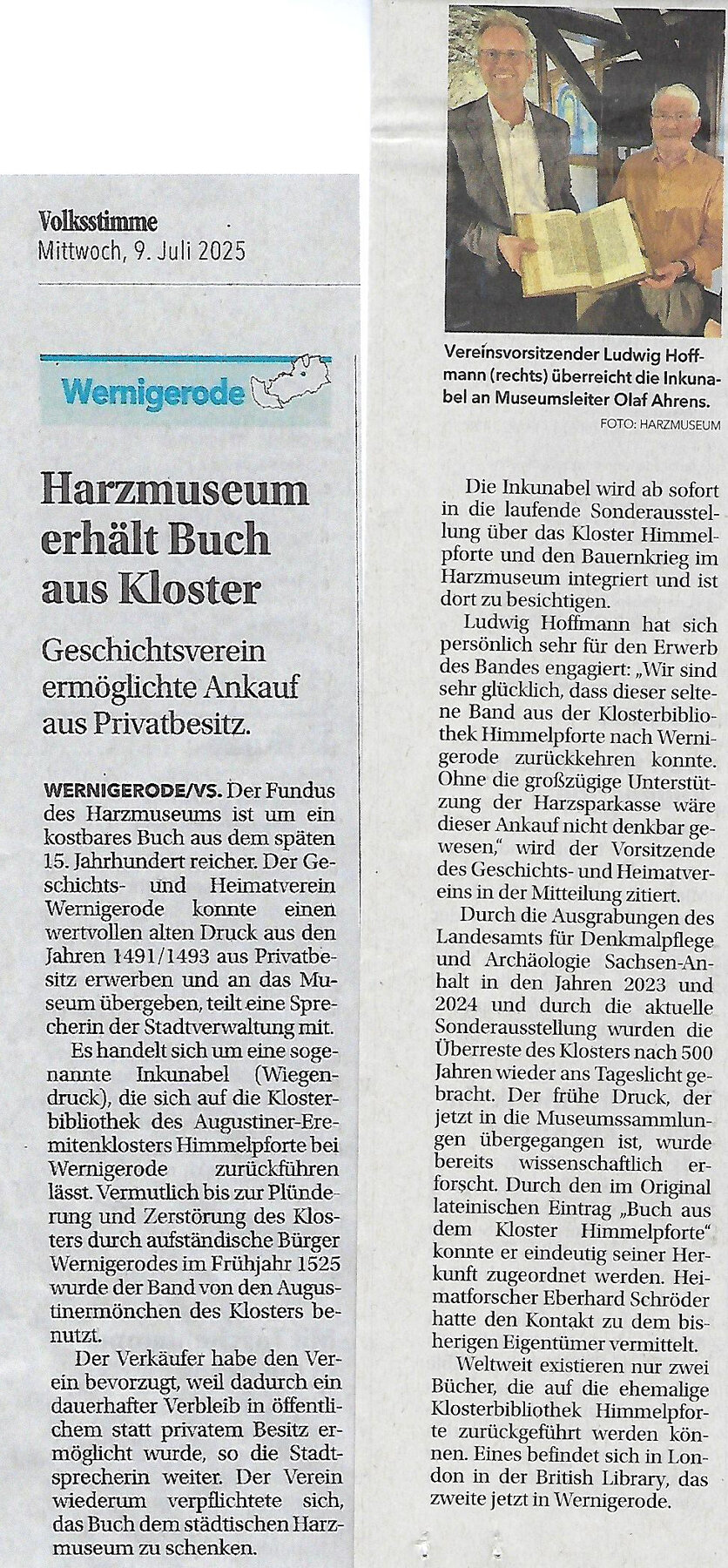 • Ankauf eines Inkunabelbandes (erschienen Ende des 15. Jahrhunderts) aus der Bibliothek des ehemaligen Klosters Himmelpforte (mit Unterstützung der Harzsparkasse (2025)