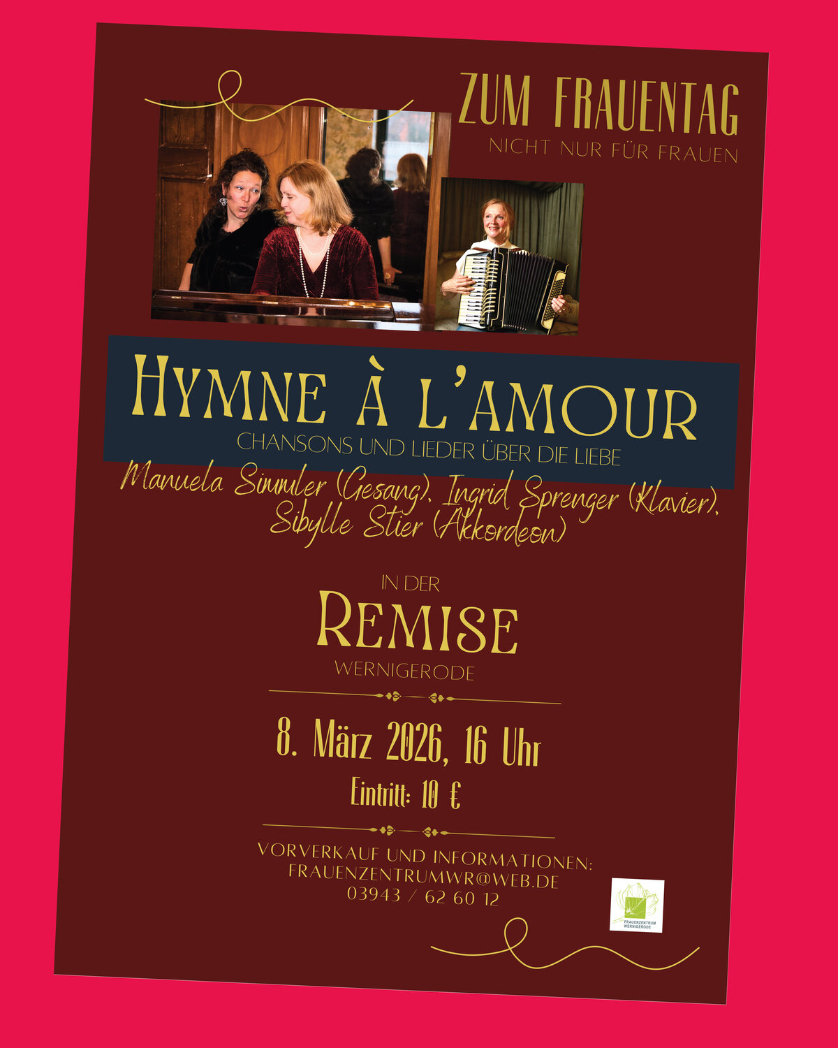 Das Frauenzentrum Wernigerode lädt am 8. März 2026 um 16:00 Uhr zu einem Konzert in die Remise, Marktstraße 1 in Wernigerode ein. Anlässlich des Internationalen Frauentags präsentieren Manuela Simmler, Ingrid Sprenger und Sibylle Stier unter dem Titel „Hymne à l‘amour“ Chansons und Lieder über die Liebe. Auf dem Programm stehen heitere und melancholische Klassiker des deutschen und französischen Chansons – von Edith Piafs „La vie en rose“ über Hildegard Knefs „Für mich soll‘s rote Rosen regnen“ bis hin zu Marlene Dietrichs „Ich weiß nicht, zu wem ich gehöre.“